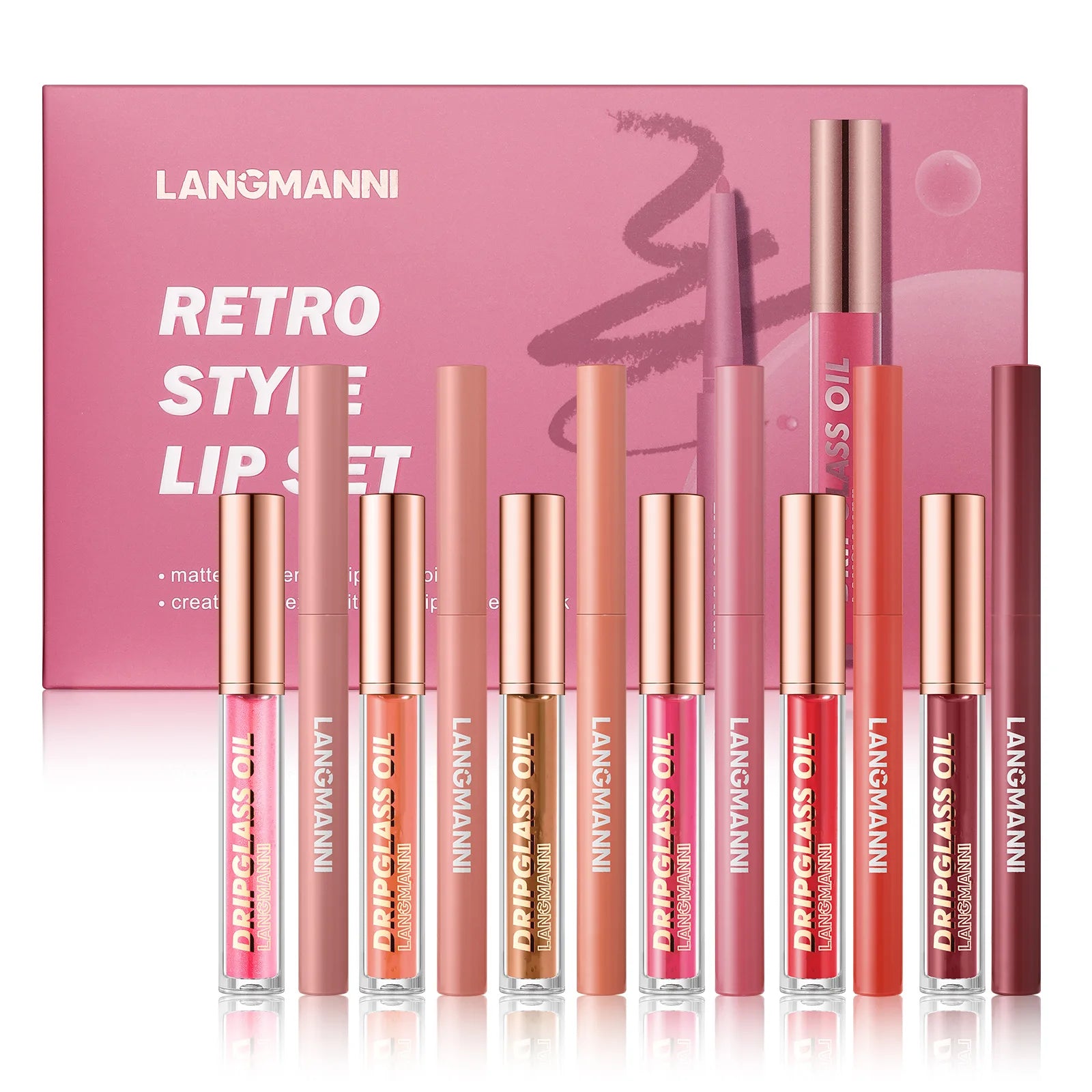 12PCS/SET Retro Style Lip Set 6pcs Lipliner Plus 6Pcs Dripglass Oil In One Box Long Lasting Matte Shinny Lip Makeup Cosmetics