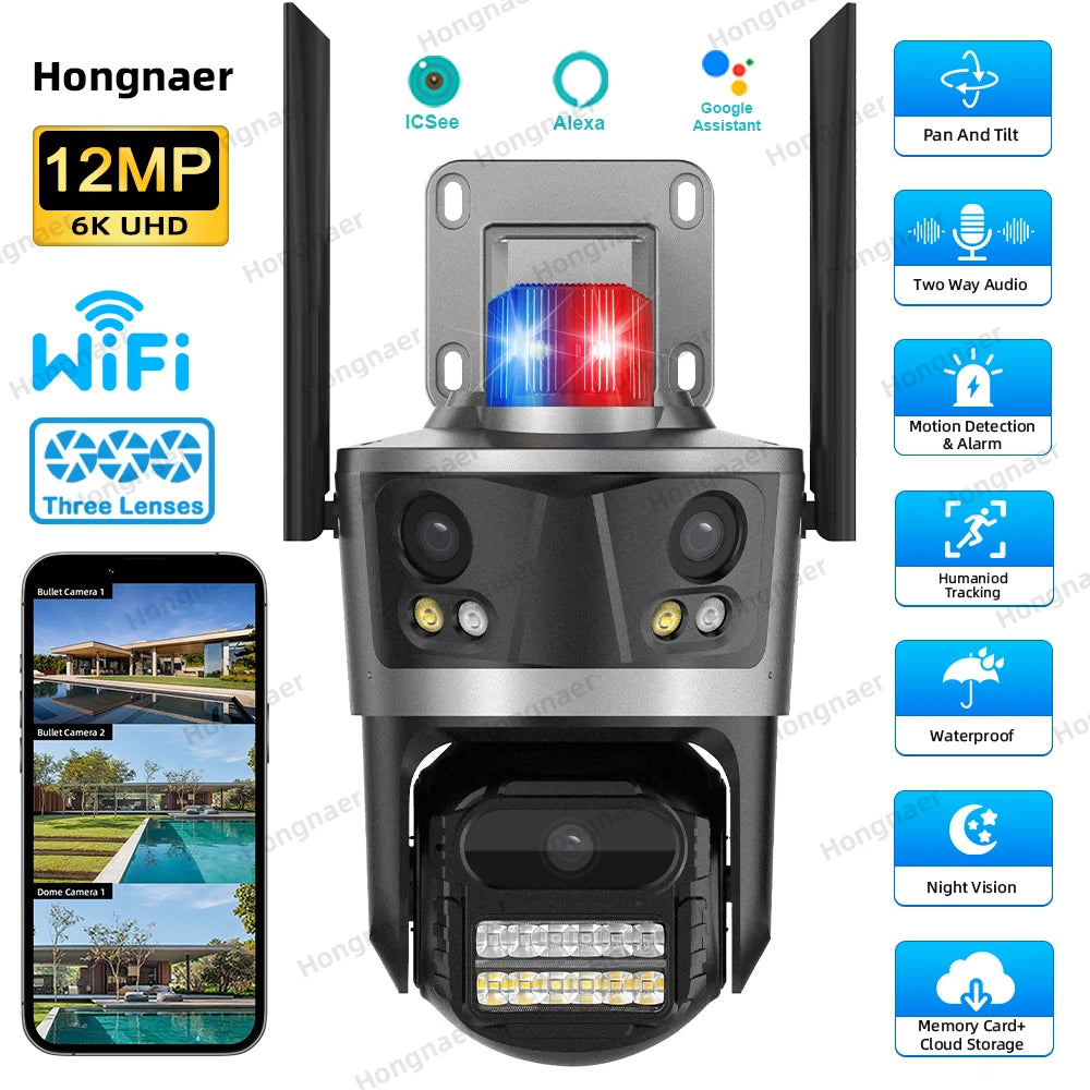 Hongnaer 12MP 6K Three Lenses Wireless WiFi Three Video PTZ Network Night Vision ICSee CCTV Outdoor WiFi Security Camera