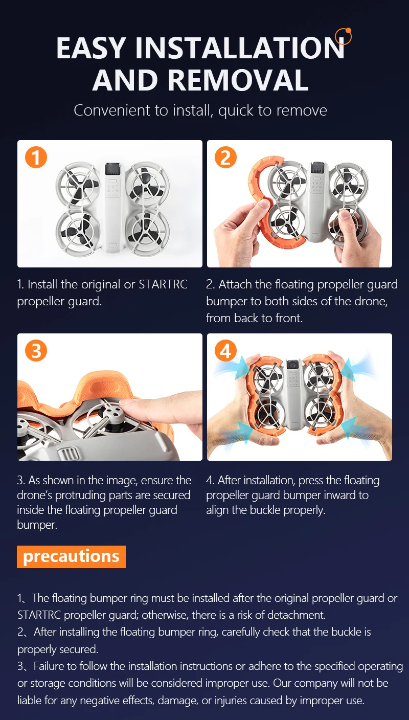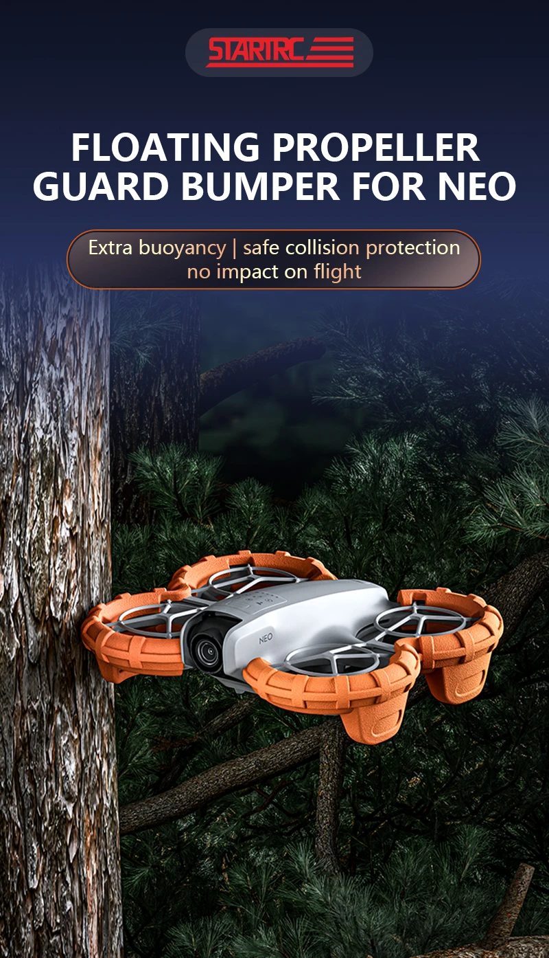 4. The installation of the buoyancy collision avoidance ring does not require tools and can be stuck on NEO propeller protection cover. It is easy to install and disassemble, will not scratch the drone body, and does not affect the installation of the gimbal protection cover and STARTRC safety rod. It is compact in size and convenient for storage.