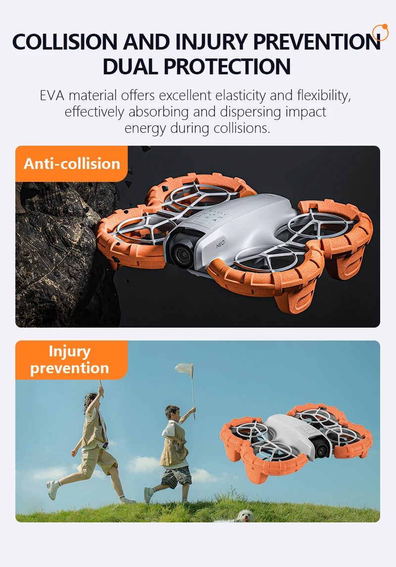 3. The buoyancy anti-collision ring is installed on DEO propeller protector, with a fortress style all inclusive design, to protect the Neo drone from accidental tree, wall, or any other obstacle injuries.