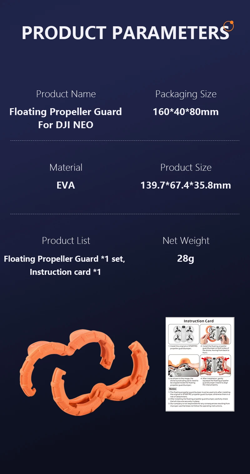 5. Orange style design, eye-catching during flight, will not shake or fall off during flight, safe for use during flight. The buoyancy anti-collision ring can prevent the neo aircraft from sinking into water and avoid the risk of salvage.